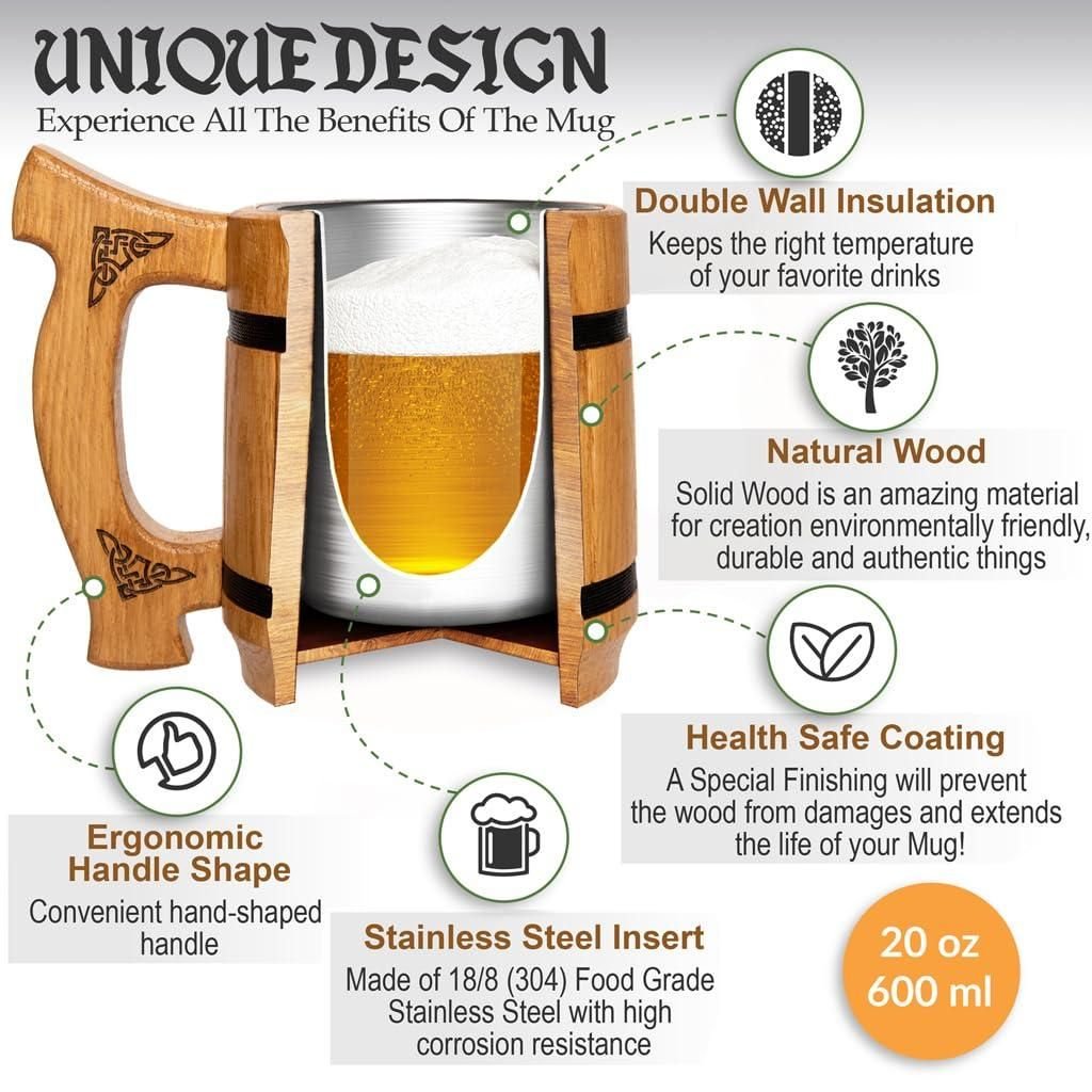 1.handmade beer mug: each norse decor mug is made from natural hardwood. an authentic wood grain gives the beer gift a natural look ensuring that each one is unique.