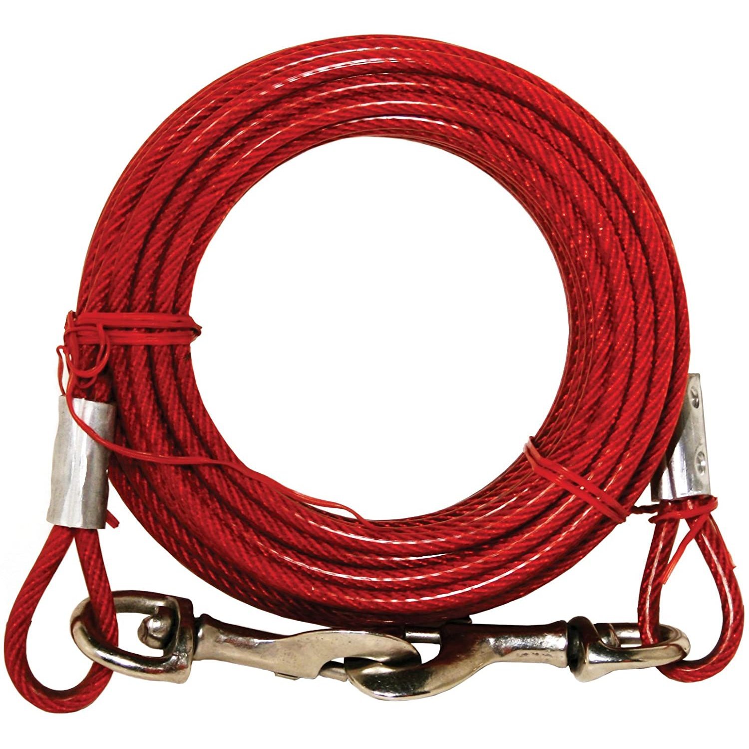Prevue Pet Products medium-duty 10Æ tie-out cable 2118 is designed for dogs up to 65 lbs. Medium duty, galvanized aircraft-grade wound-steel cable is housed within crack-resistant, high visibility Red vinyl casing to ensure your dog stays safe and secure. Premium quality die-cast iron swivel bolt snaps at both ends to connect easily. Medium duty tie out cable is 10 foot long with a 3.3 mm diameter wire cable; 4.8 mm in vinyl casing.