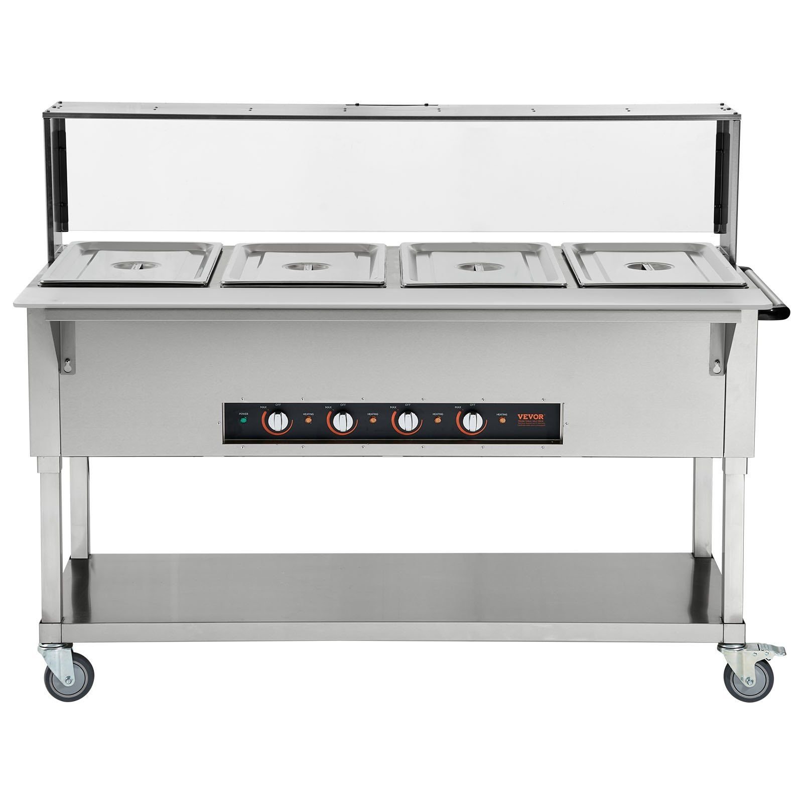 4.Acrylic Sneeze Guard: We have improved overall food safety by adding a clear sneeze guard to the front of the buffet server. It effectively protects the food from moisture and droplets in the air, ensuring a safer dining experience for all guests. 4 flexible casters (including 2 lockable) offers easy movement and stable positioning.