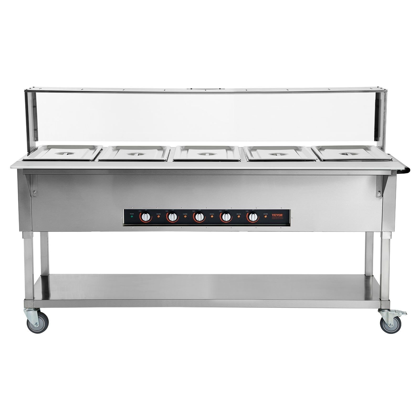 4.Acrylic Sneeze Guard: We have improved overall food safety by adding a clear sneeze guard to the front of the buffet server. It effectively protects the food from moisture and droplets in the air, ensuring a safer dining experience for all guests. 4 flexible casters (including 2 lockable) offers easy movement and stable positioning.