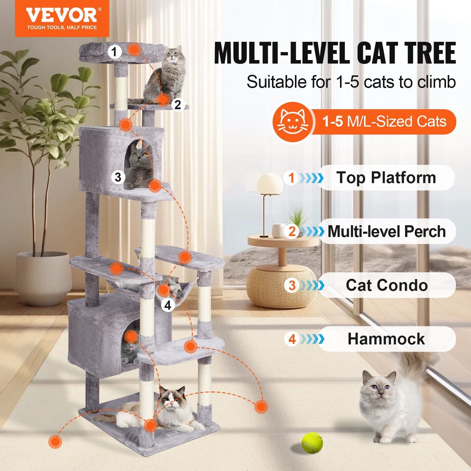 Home > VEVOR Cat Tree for Indoor Cats, 72" Cat Tower with 2 Cat Condos, Sisal Scratching Post, Hammock, Top Perch, Jumping Platforms