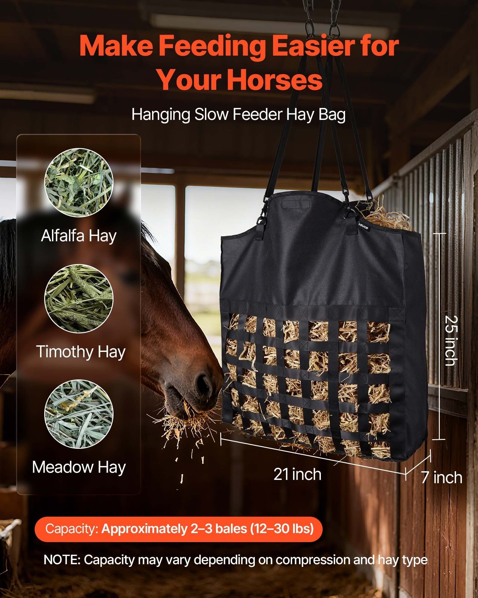 1.Quick Fill Design: Measuring 21.65 x 7.28 x 25.2 in, this slow feed hay bag holds about 2-3 bales (12-30 lbs) of timothy, orchard, or alfalfa hay. The wide opening allows for quick and easy filling in seconds, ensuring efficient feeding for your livestock