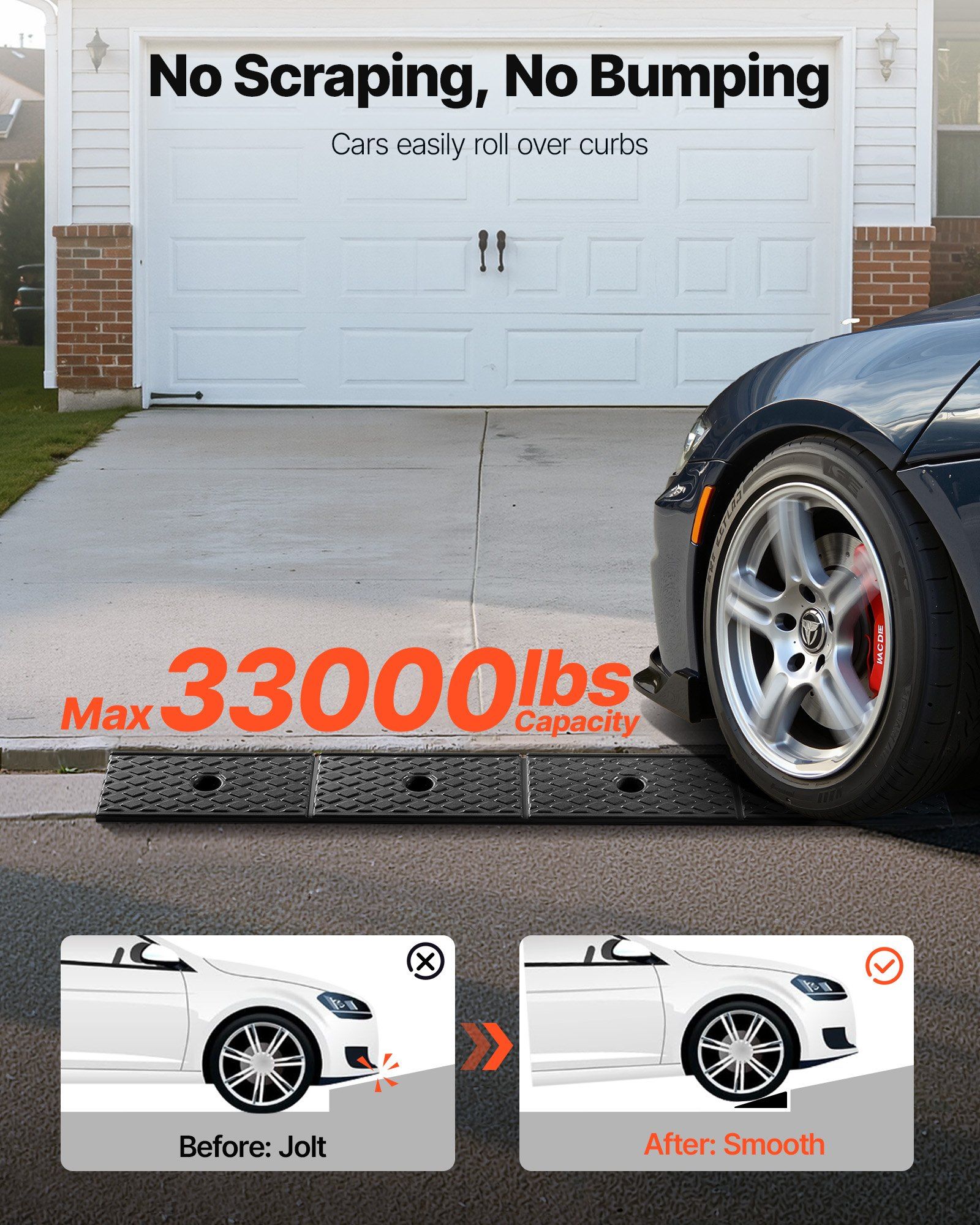 1.Secure Your Vehicle: With a 15-ton weight capacity, this curb ramp is ideal for frequent garage use. It keeps your car's tires and undercarriage secure from curb damage, ensuring a smooth entry and exit for SUVs and pickups